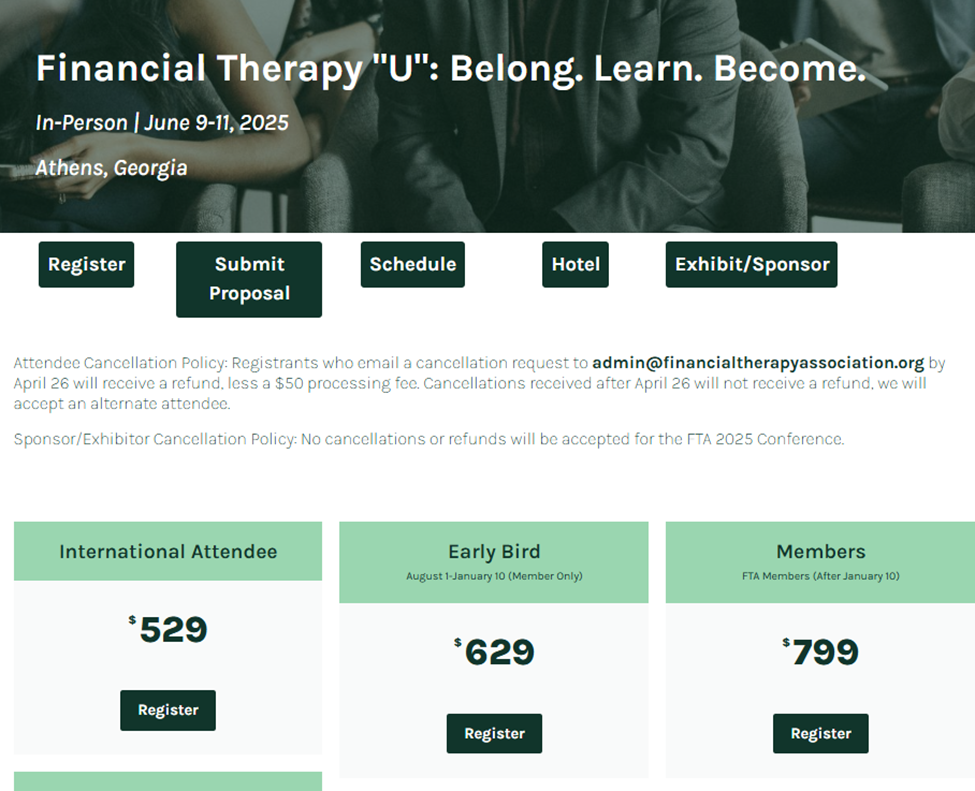 Those who follow me on social media likely know that the Financial Therapy Association conference is one of my favourite events to attend each year. I’ve attended once virtually and twice live. I’m going to show you in this 2-part series why I think you should attend in Athens, Georgia, this year.