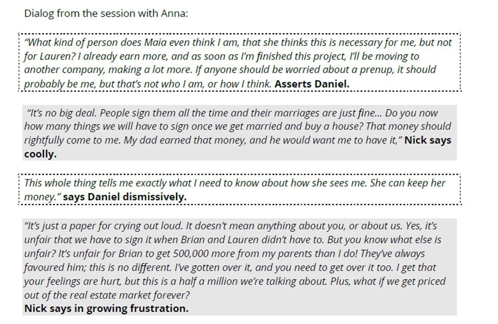 The case study alive through the inclusion of direct quotes from a (fictional) conversation between Anna, the financial therapist in the case, and Nick and Daniel. I find students are never happy with case studies – it always feels like there is either too much or too little information. Including these conversation snippets can help a lot, as it mirrors real life, where the advice giver must interpret what’s been said and turn that into something useful.