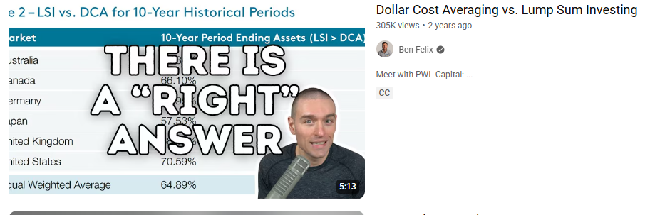 Ben Felix has this handy video walking through the thought of invest now or invest over time (dollar cost averaging) which talks about the historical results of delaying investing.