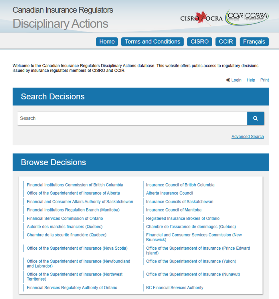 All thirteen provinces and territories participate in the Canadian Insurance Regulators Disciplinary Actions database. Decisions levied in the past 6 years or so, and any new decisions, should be searchable here.